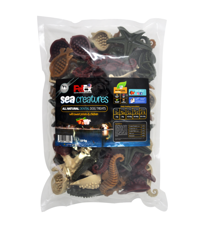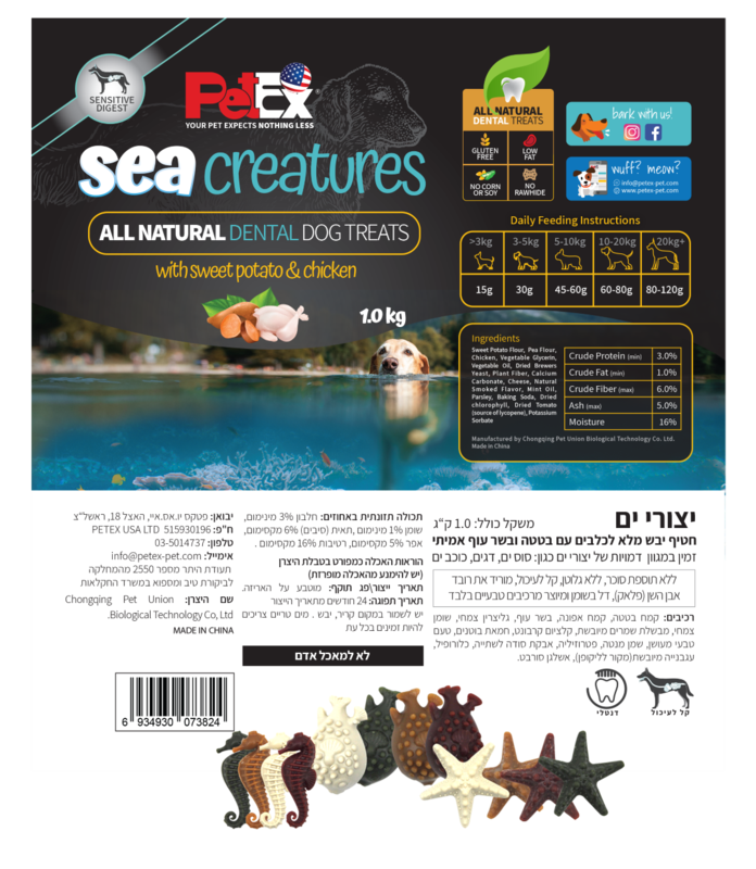 יצורי ים - חטיף דנטלי לכלבים- עם בטטה ובשר עוף אמתי במשקל של 1 ק"ג